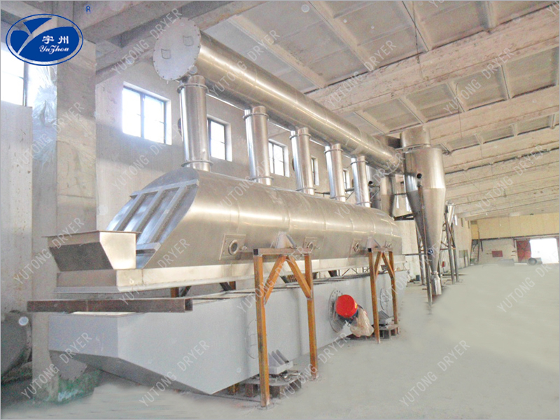 物料自進料口進入機內(nèi),在振動電機或其他方式提供的激振力作用下,在空氣分布板上跳躍前進,同時空氣經(jīng)過濾后,被加熱到一定溫度,由風口進入干燥機下風室中,物料在振動力和經(jīng)空氣分布板均風的熱氣流雙重作用下,呈懸浮狀態(tài)與熱氣流接觸,物料顆粒與熱介質之間進行著激烈的湍動,使傳熱和傳質過程得以強化,干燥后的產(chǎn)品由排料口排出,蒸發(fā)出的水份和廢氣經(jīng)旋風分離器回收粉塵后,排入大氣。下床體為床層提供了一個穩(wěn)定的具有一定壓力的風室。調節(jié)引風機,使上箱體中床層物料上部保持微負壓,維持良好干燥環(huán)境并防止粉塵外泄。